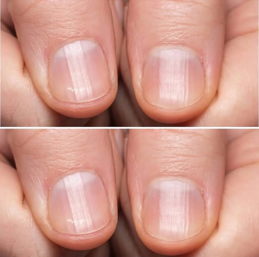 To się nazywa onychorreksja. Te pionowe linie na całej długości mogą być spowodowane starzeniem się lub chorobami, takimi jak łuszczyca paznokci, liszaj płaski, który ścieńcza i pęka płytkę paznokcia lub łysienie plackowate.